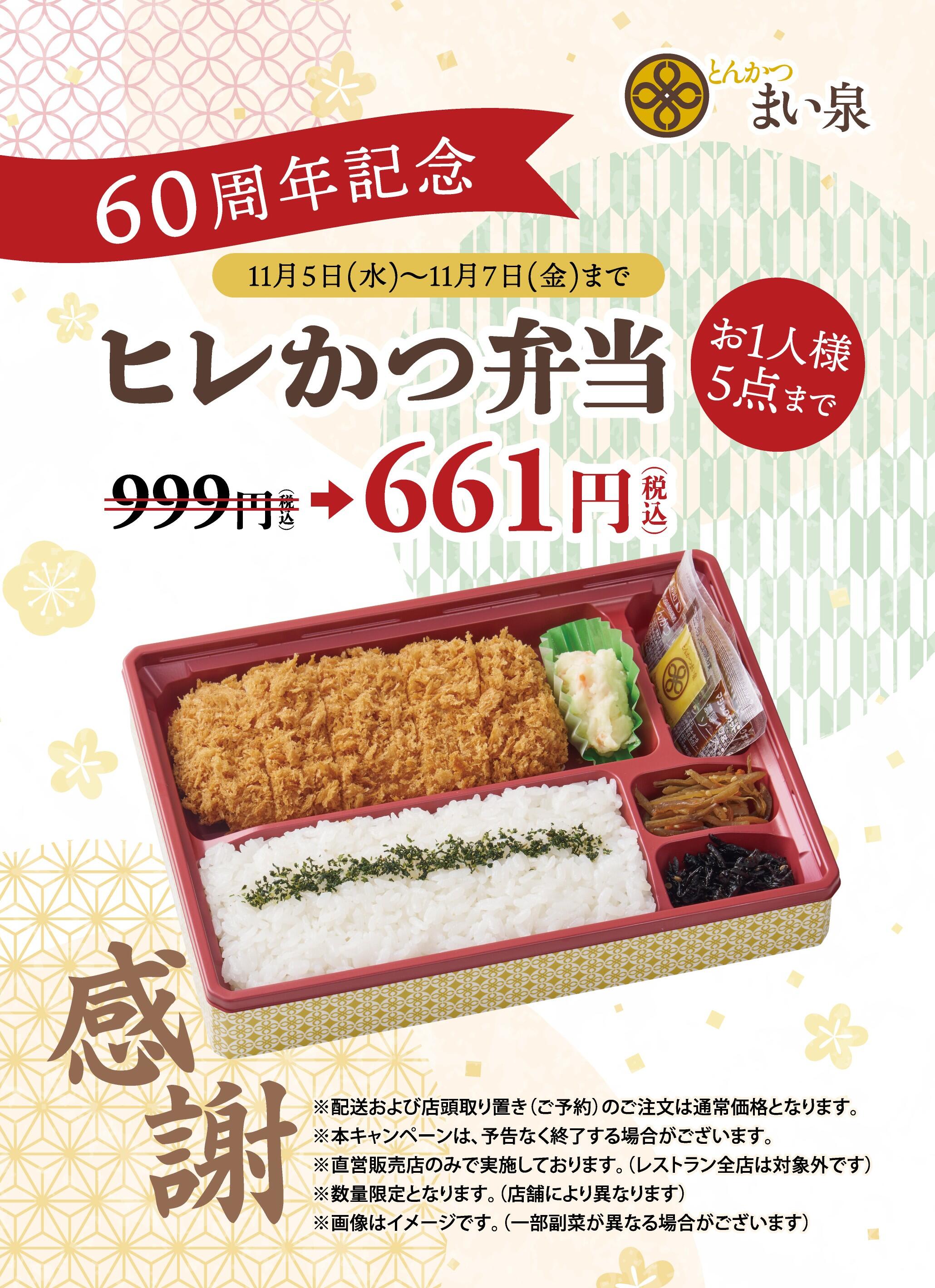 お客様のご愛顧に支えられ、「とんかつ まい泉」は2025年11月に創業60周年を迎えます。日頃の感謝の気持ちを込め、まい泉直営販売店にて「ヒレかつ弁当」を特別価格で販売いたします。特別価格でのご購入は、お1人様5点までとさせていただきます。ぜひこの機会に、皆さまのご来店をお待ちしております。