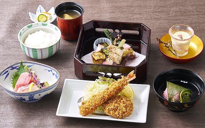 今月のおすすめ膳 黒豚とんかつと春の海鮮ミックスフライ膳 ¥2,720(税込み) まい泉自慢の黒豚とんかつと旬の鰆フライ、車海老フライを盛り合わせた御膳です。「黒豚」とんかつはヒレまたはロースよりお選びいただけます。
