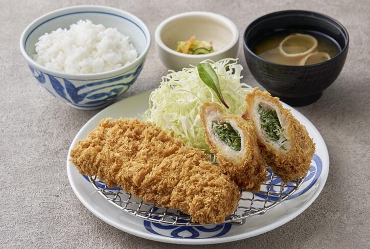 3月のおすすめ膳 とんかつと京都産九条ネギの巻きかつ膳 ¥1,720(税込み) まい泉自慢のとんかつと刻んだたっぷりの京都産九条ネギを豚肉で巻いたかつを盛り合わせた御膳です。とんかつはヒレまたはロースよりお選びいただけます。