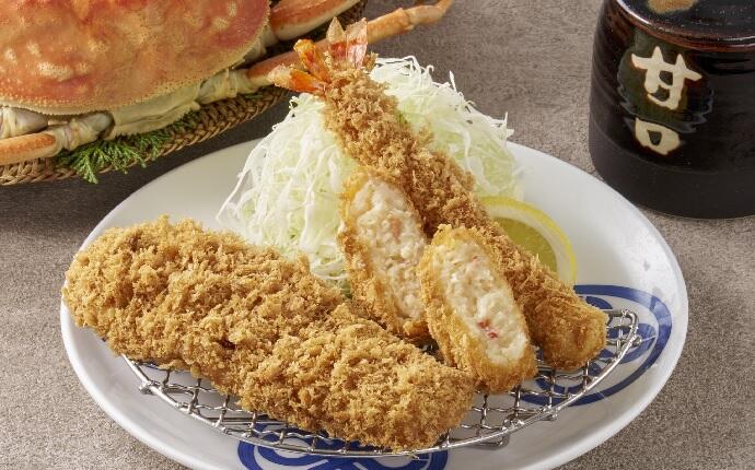 12月のおすすめ膳 とんかつと冬の海鮮ミックスフライ膳 ¥1,990(税込み) まい泉自慢のとんかつと本ズワイガニのほぐし身と蒸し汁を使用したクリームコロッケ、ぷりぷりとした食感のエビフライを盛り合わせた御膳です。とんかつはヒレまたはロースよりお選びいただけます。