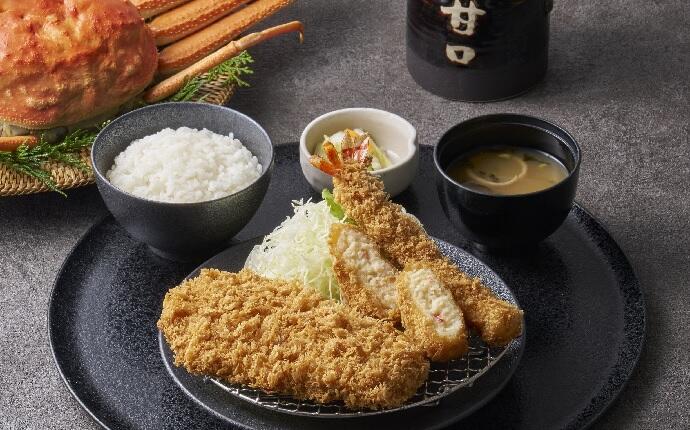 今月のおすすめ膳 とんかつと冬の海鮮ミックスフライ膳 ¥1,990(税込み) まい泉自慢のとんかつと本ズワイガニのほぐし身と蒸し汁を使用したクリームコロッケ、ぷりぷりとした食感のエビフライを盛り合わせた御膳です。とんかつはヒレまたはロースよりお選びいただけます。