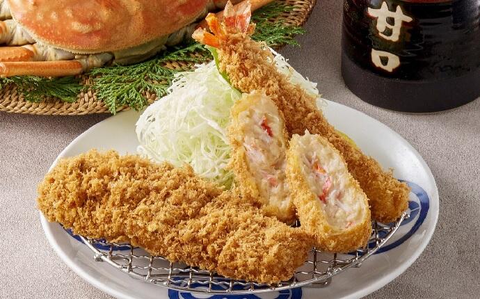 12月のおすすめ膳 茶美豚とんかつと冬の海鮮ミックスフライ膳 ¥2,430(税込み) お茶の成分を含んだ飼料で育ちさっぱりと食べやすい銘柄豚「茶美豚」とんかつと本ズワイガニのほぐし身と蒸し汁を使用したクリームコロッケ、ぷりぷりとした食感のエビフライを盛り合わせた御膳です。「茶美豚」とんかつはヒレまたはロースよりお選びいただけます。